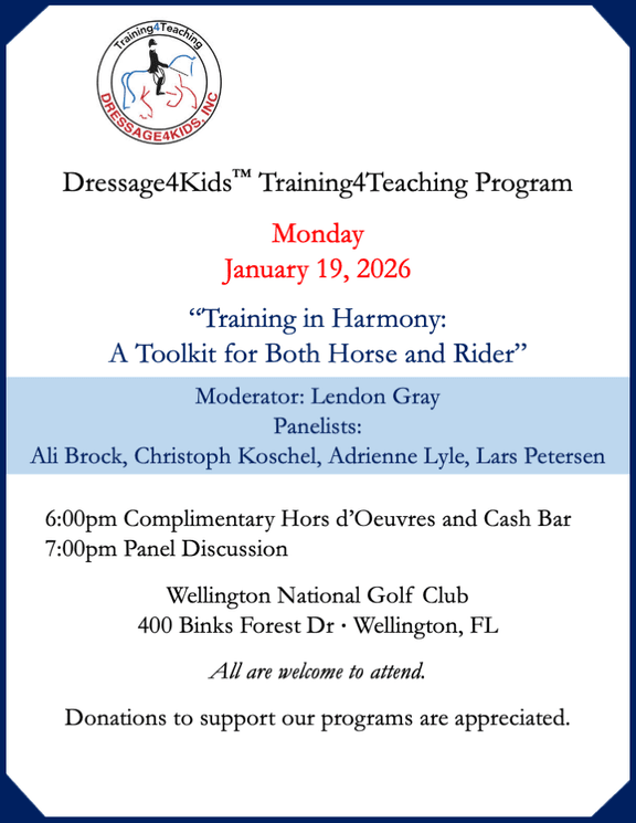 Join Dressage4Kids on Monday, January 19th in Wellington, Florida following the Adequan®/USDF FEI Level Trainers Conference as we welcome panelists as part of the Dressage4Kids Training4Teaching Program! All are welcome to attend.