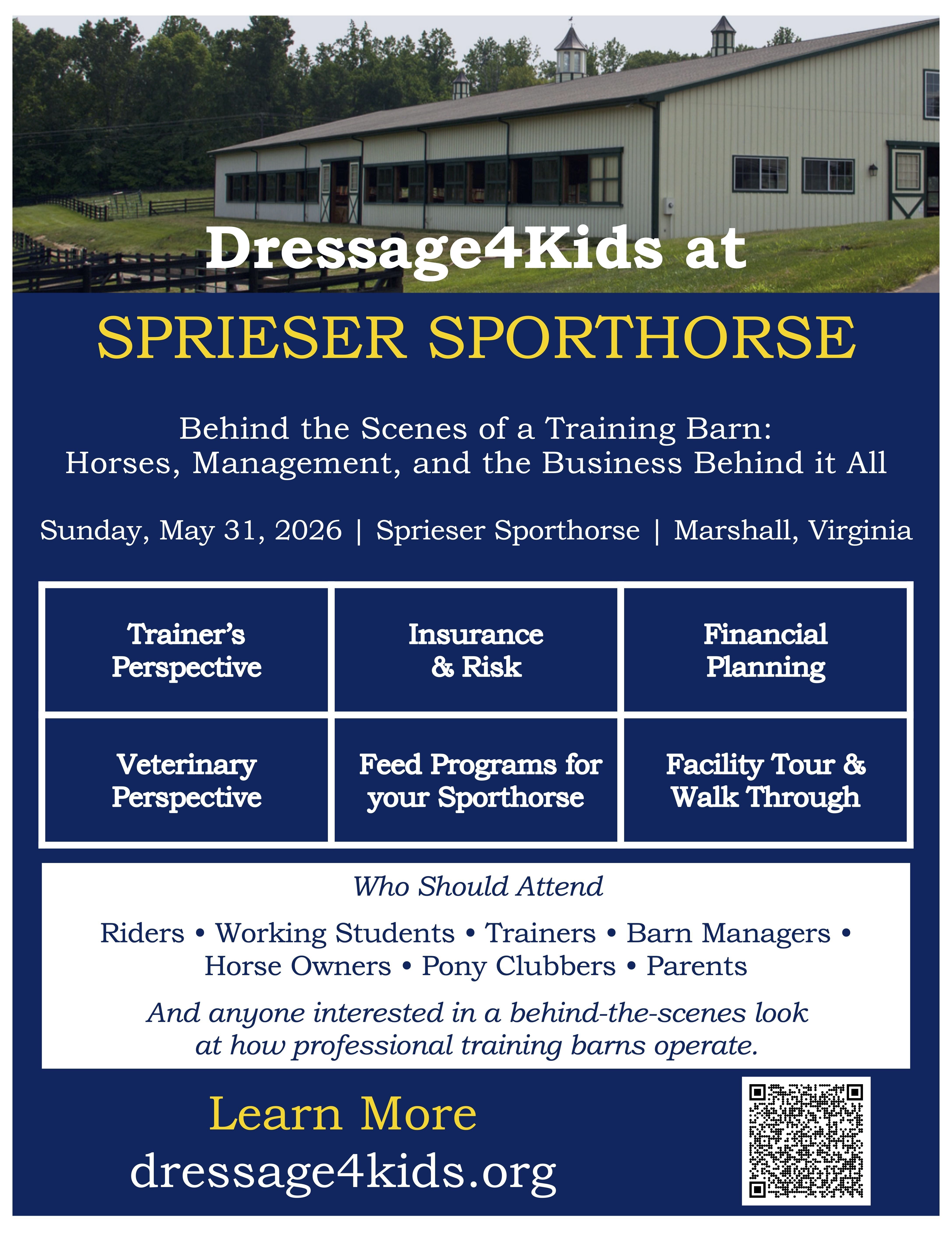 Dressage4Kids and Sprieser Sporthorse are pleased to present a special event "Behind the Scenes of a Training Barn: Horses, Management, and the Business Behind it All"